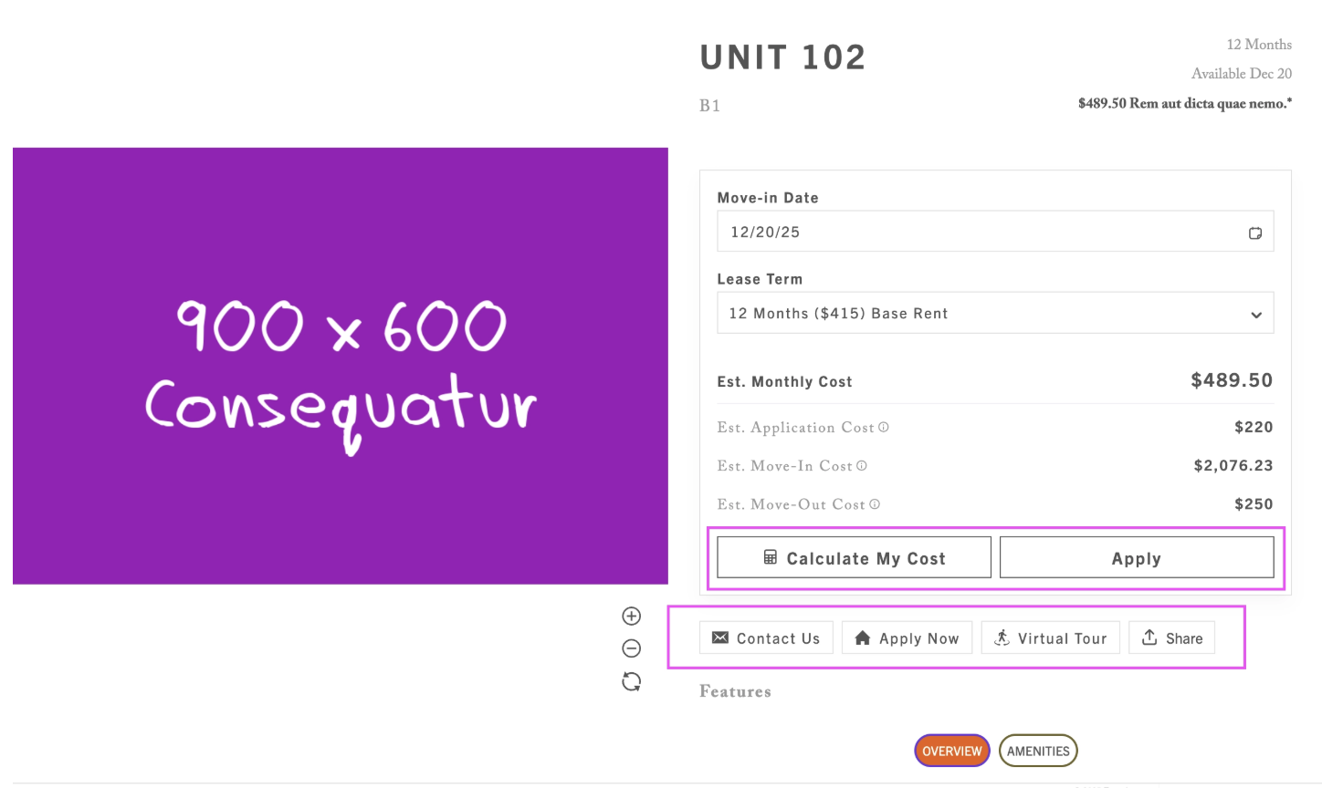 We’ve improved the layout of the SightMap Unit Modal to make call-to-action buttons (CTAs) more visible and easier to engage with. CTAs—including Apply, Calculate My Cost, and Share—now appear much higher in the modal, directly below the unit’s key pricing details. This update went live in December 2025.
